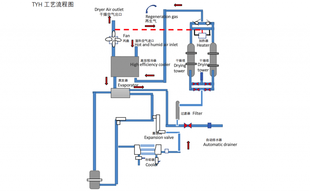 它是由冷凍干燥機(jī)、微熱再生干燥機(jī)有機(jī)組合而成,這兩者在流程設(shè)置上有緊密不可分的內(nèi)在聯(lián)系。其裝置中冷干機(jī)預(yù)冷器(通過進(jìn)出口氣大面積熱交換除水)換熱面較大,可除去壓縮空氣中總含水量的73%左右的水。冷干機(jī)蒸發(fā)器(冷媒制冷)可除去壓縮空氣中總含水量的19%左右的水份,微熱干燥機(jī)只需除去壓縮空氣中總含水量的8%左右的水份就可達(dá)到深度干燥壓縮空氣的目地。