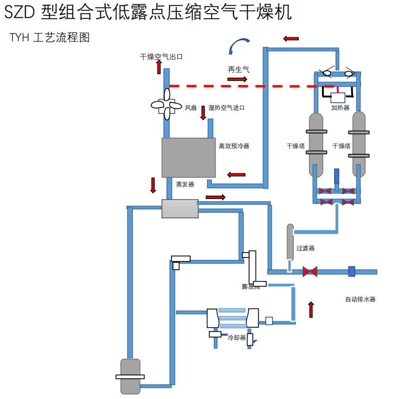 壓縮后的空氣進(jìn)入組合式干燥機,由于氣體壓縮溫度升高首先在高效預(yù)冷器中降低溫度,然后進(jìn)入蒸發(fā)器被進(jìn)一步降溫至2℃左右,在此壓力露點下大部分氣態(tài)水分變成液體水被自動排水器排出,然后通過過濾器進(jìn)一步除去水分。接下來進(jìn)入干燥塔內(nèi)被進(jìn)一步干燥除濕,得到更低露點的成品氣,最后冷卻后的干燥壓縮空氣進(jìn)入高效預(yù)冷器,冷卻了高溫高濕空氣,同時本身溫度也升高,防止了輸送管路的外結(jié)露,且升溫后的壓縮空氣一小部分用作吸附劑再生,提高再生效率,降低能耗。